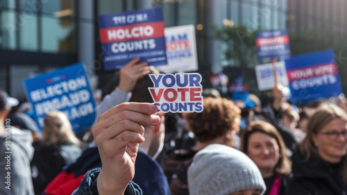 © Marut, Fototapeta premium Your vote counts! This image captures vibrant scene of crowd holding signs advocating for voter participation and importance of elections. atmosphere is filled with energy and determination