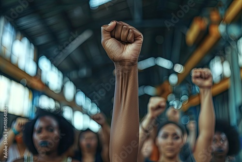 Obraz premium Youth activists hold hands while marching during a peaceful protest in a city...