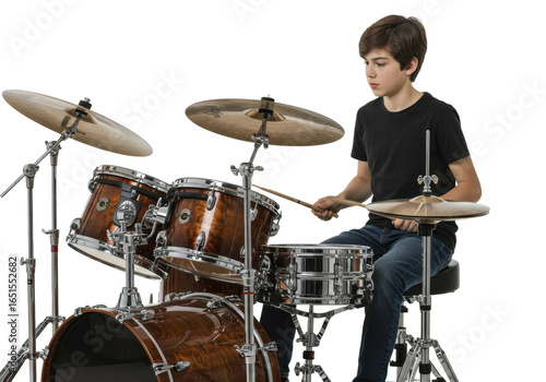Fototapeta premium Youth drummer performing an energizing solo home studio music session indoor eye-level rhythm and passion isolated on transparent background