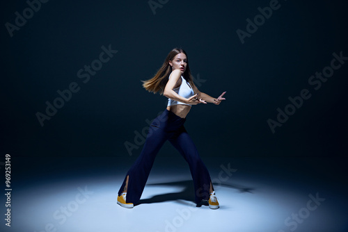 © master1305, Obraz premium Youthful passion on display. Young energetic woman dancing hip hop with precision against navy blue studio background. Concept of freestyle dance, modernity, urban culture, youth