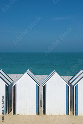 Naklejka premium Yport, Holzhäuser am leeren Strand, symmetrisch
