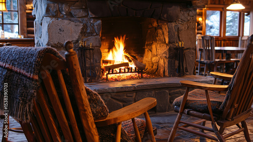 © AI.noevation, Fototapeta premium Yule Fire Festival, Cozy Fireplace Setting With Rocking Chair And Flickering Log Flames Invoking Ancient Winter Solstice Ritual And Communal Reindeer Gatherings