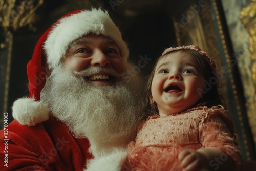 © R, Obraz premium Yule promotion creative pic for magazine ad and internet marketing use. Jolly christmas, сute baby girl joyful with santa claus. Christmas happiness ads. Santa claus holding child.