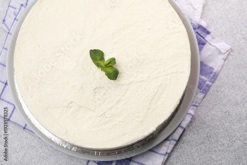 Fototapeta premium Yummy cheesecake with mint on grey table, top view