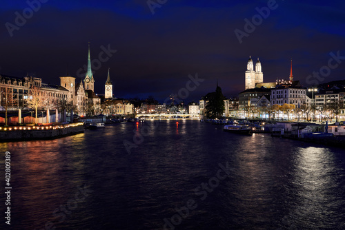 Naklejka premium Zürich Altstadt bei Nacht, Blick von Quaibrücke Richtung Münsterbrücke und die Kirchen Fraumünster, St. Peter und Grossmünster