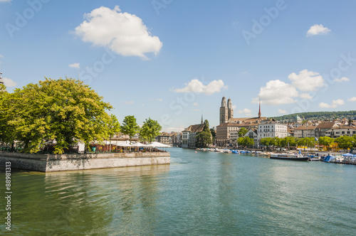 Naklejka premium Zürich, Altstadt, Stadt, Limmatquai, Limmat, Grossmünster, Münsterbrücke, Sommer, Schweiz