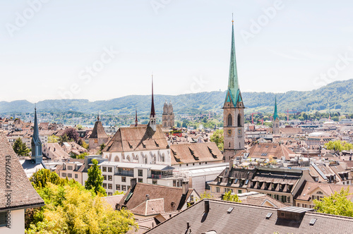 © bill_17, Naklejka premium Zürich, Predigerkirche, Fraumünster, Kirche, Grossmünster, Altstadt, Altstadthäuser, Stadt, Predigerplatz, Zwingliplatz, Aussichtspunkt, Sommer, Schweiz