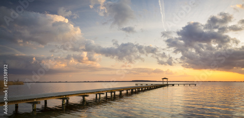Obraz premium Zachód słońca nad jeziorem,drewniany pomost