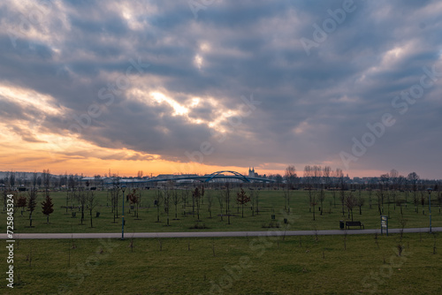 © FIOMI, Obraz premium Zachód słońca nad parkiem z widokiem na łukowy most