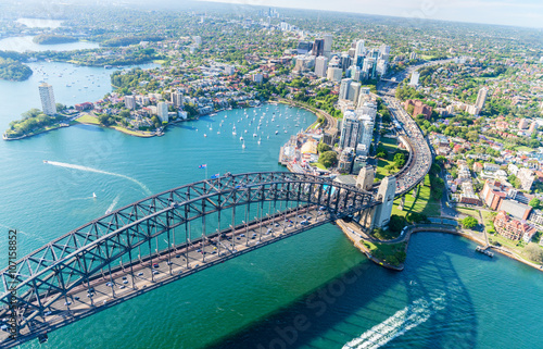 © jovannig, Fototapeta premium Zachód słońca nad Sydney Harbour, widok z helikoptera