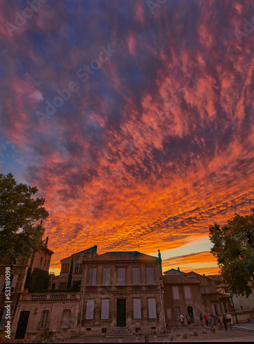 © Tomasz, Fototapeta premium Zachód słońca w Avignon, Prowansja, Okcytania, Francja. Płomienie na niebie. Czerwony, purpurowy, karmin, pomarańcz.