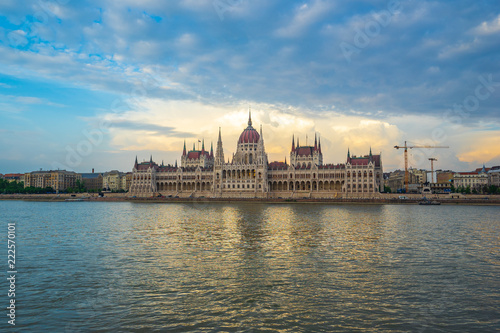 © orpheus26, Obraz premium Zachód słońca widok na budynek parlamentu w Budapeszcie z widokiem na Dunaj na Węgrzech