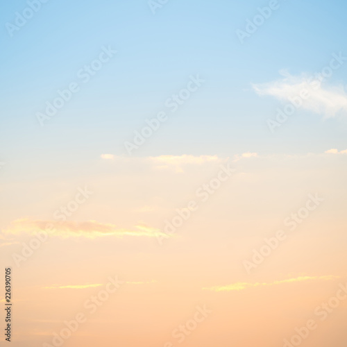 Obraz premium Zachód słońca ze słońcem i chmurami na pastelowym niebieskim i pomarańczowym...