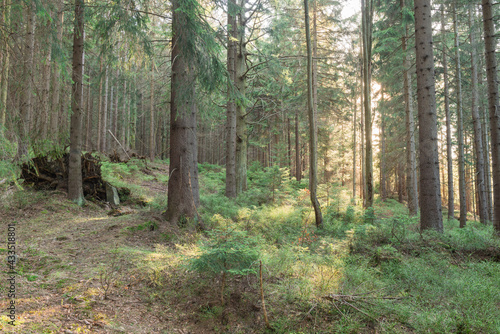 © boguslavus, Fototapeta premium Zachodzące słońce oświetlające swym blaskiem świerkowy, górski las.