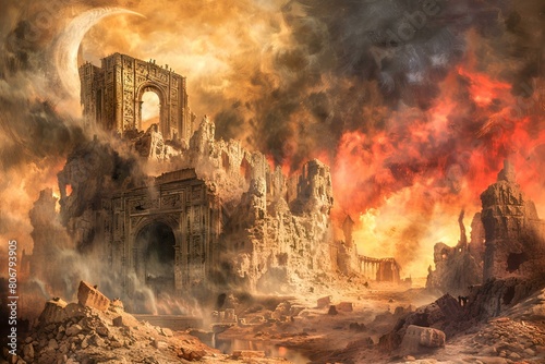 Obraz premium Zagłada Sodomy i Gomory – apokaliptyczna wizja zniszczenia miast ogniem i dymem, symbol boskiego gniewu, sądu ostatecznego i końca zepsutej cywilizacji.