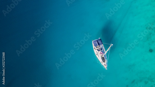 © Jag_cz, Fototapeta premium Żaglowiec kotwiczący w zatoce Chorwacja, widok z lotu ptaka.