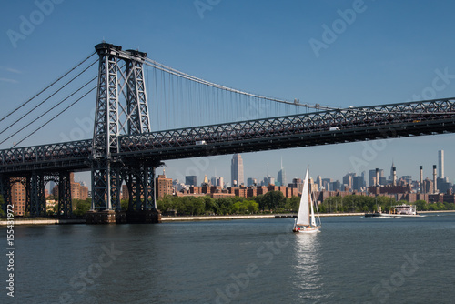 © EPasqualli, Fototapeta premium Żaglówka przepływa pod mostem Williamsburg łączącym Manhattan z Brooklynem