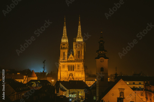 © ilijaa, Fototapeta premium Zagreb Cathedral and St. Mary's Church in the night. Capital of Croatia, panoramic view