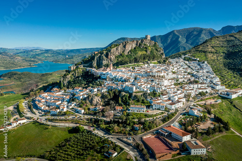 Obraz premium Zahara de la Sierra aerial view of medieval castle, hilltop village and lake...