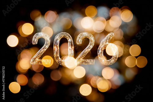© LElik83, Fototapeta premium Zahl 2026 vor buntem Bokeh – festliche Neujahrs- und Silvesterstimmung