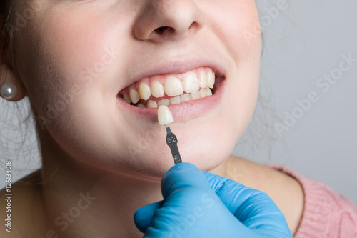 © StudioLaMagica, Obraz premium Zahnfarbe für Zahnersatz wird abgeglichen