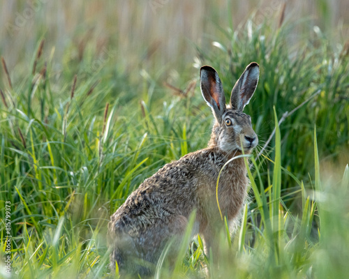 Fototapeta premium zając szarak wiosną na łące w świetle zachodzącego słońca