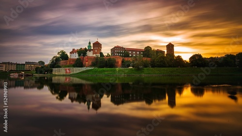© Michal45, Naklejka premium Zamek Królewski na Wawelu o wschodzie słońca ze złotym niebem w tle