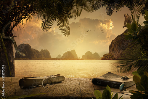 © Dmitry Vavilon , Fototapeta premium zamknąć widok antycznej książki z rocznika papierami i pierścień na wstecznym tropic zachód słońca