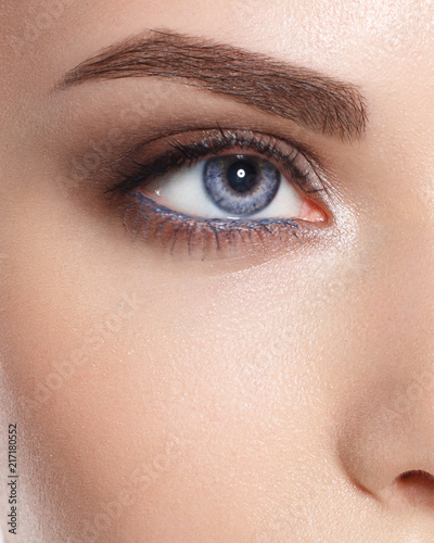 Fototapeta premium Zamknij się niebieskie oko kobiety z pięknym brązowym z odcieniami czerwieni...
