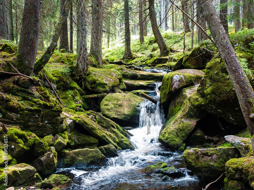© weruskak, Fototapeta premium Zamontuj leśny wodospad między omszałymi skałami