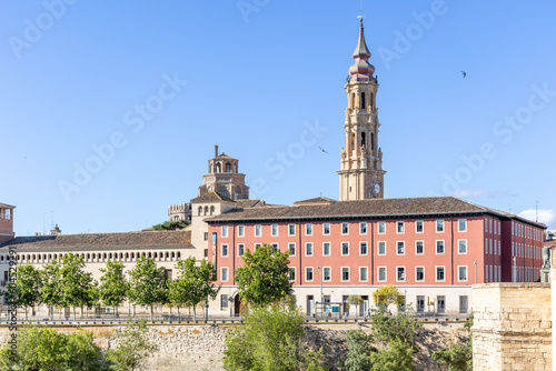 Naklejka premium Zaragoza, Spain - May 01, 2023: details of the main tower of the Zaragoza cathedral called La Seo in Zaragoza, Spain