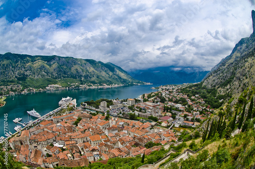 Naklejka premium Zatoka Kotorska, dachy starego miasta i port. Plaża nad Morzem Adriatyckim i m