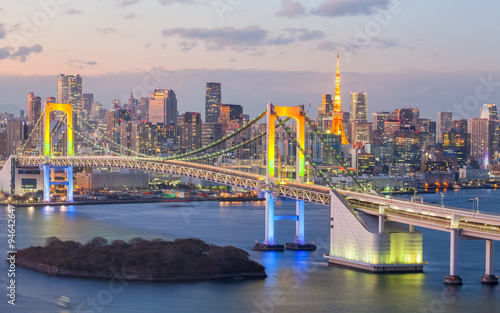 © torsakarin, Fototapeta premium Zatoka tokijska i most tęczowy w Tokio wieczorem