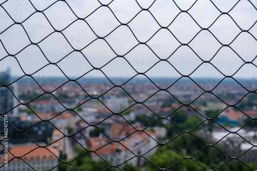 Fototapeta premium Zaun mit Stadt im unscharfen Hintergrund