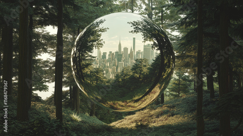 Naklejka premium Zawieszone w środku lasu lustro odbija tętniącą życiem panoramę miejską,...