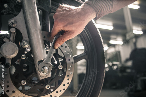 © oksanazahray, Obraz premium Zbliżenie dłoni człowieka trzyma klucz montażowy w pobliżu pojazdu motocykla. Garaż w tylnym świetle na tle