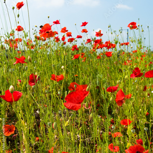 Obraz premium Zbliżenie dzikich czerwonych maków (Papaver rhoeas) na łące.