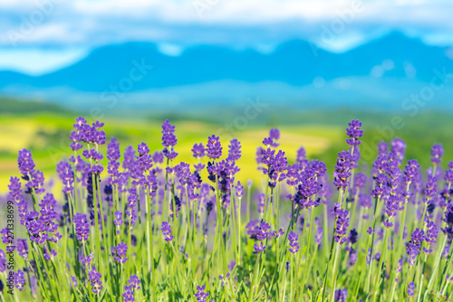 © Shawn.ccf, Naklejka premium zbliżenie fioletowe pole kwiatów lawendy w słoneczny letni dzień z miękkiej ostrości rozmycie naturalnego tła. Furano, Hokkaido, Japonia