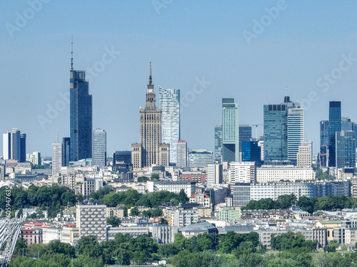 © Arkadiusz, Fototapeta premium Zbliżenie i widok z lotu ptaka na wieżowce w centrum Warszawy w słoneczny dzień, pałac kultury, varso tower