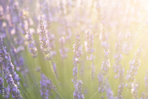 Naklejka premium Zbliżenie kwiatów lawendy z jasnym letnim światłem słonecznym