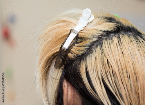 Obraz premium Zbliżenie makro strzał obraz fryzjerka fryzjer cięcia klienta kobieta włosy w...