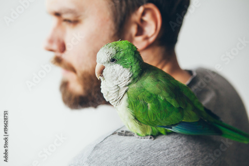Naklejka premium Zbliżenie: młody brodaty mężczyzna ze swoją papugą Quaker na ramieniu w domu