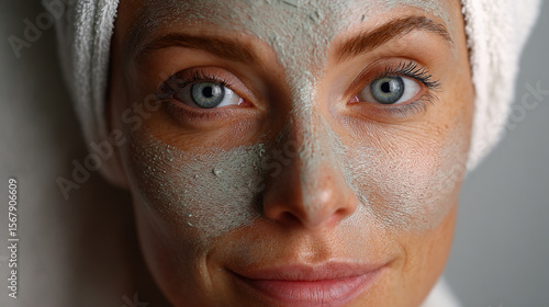 © Jenjira, Fototapeta premium Zbliżenie na kobietę o niebieskich oczach nakładającą zieloną maseczkę na twarz i noszącą biały ręcznik na głowie, pokazującą spokojną pielęgnację skóry