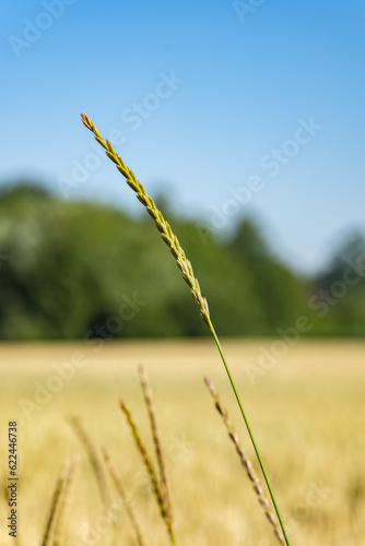 Obraz premium Zbliżenie na trawy z krajobrazu wiejskiego w porze letniej, pola kwitnące a wraz z nimi plony i drzewa w oddali na tle błękitnego nieba z niemalże bezchmurną pogodą