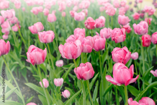 Fototapeta premium Zbliżenie różowe tulipany w dziedzinie różowe tulipany. Selektywne skupienie....