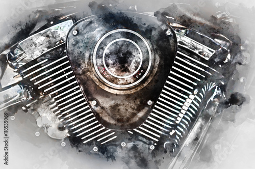 © Alex Tihonov, Fototapeta premium Zbliżenie silnika motocykla. Cyfrowy obraz akwarelowy.