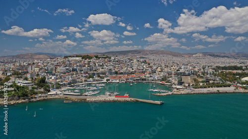 © aerial-drone, Obraz premium Zdjęcie lotnicze drone słynnego okrągłego portu Mikrolimano w krajobrazie miejskim w Pireusie, Attyka, Grecja
