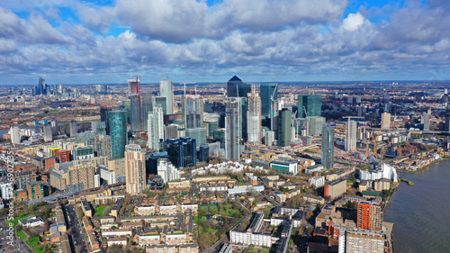 © aerial-drone, Fototapeta premium Zdjęcie panoramiczne z lotu ptaka wykonane dronem słynnego kompleksu wieżowców Canary Wharf i dzielnicy biznesowej, Isle of Dogs, Londyn, Wielka Brytania