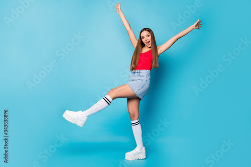 © deagreez, Obraz premium Zdjęcie w pełnym rozmiarze zdziwiona dziewczyna spacer idź wiosenne wakacje wolny czas śliska droga jesień krzyk omg podnieś ręce ręce nogi nosić dobry wygląd podkoszulek obuwie izolowany niebieski kolor tło