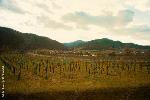 Fototapeta premium Zdjęcie widoku czystej austriackiej winnicy wiosną w pobliżu wioski i...